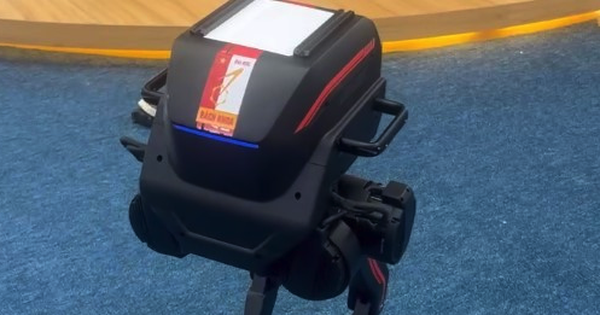 Robot hai chân bị che logo và nhãn mác của nhà sản xuất nước ngoài, thay vào đó là logo của ĐH Bách khoa Hà Nội