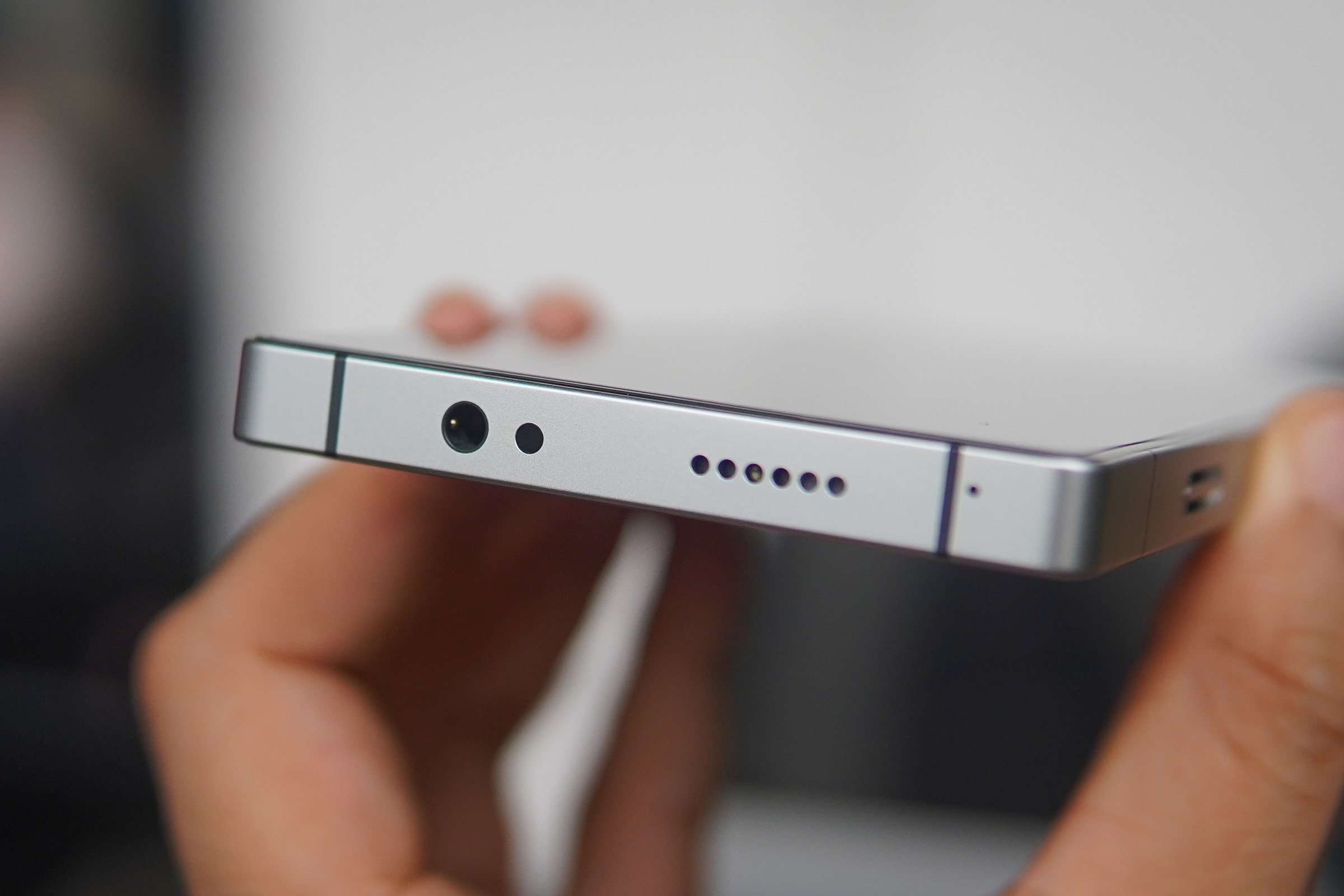Với độ dày này, hãng cũng thỏa sức đặt các cổng kết nối, nút bấm và khe tản nhiệt. Ở cạnh đáy, máy được trang bị cổng USB-C, loa ngoài và khe SIM. Dàn loa kép bố trí ở đỉnh và đáy máy cho hiệu ứng âm thanh stereo, nhưng không dễ cảm nhận với một thiết bị nhỏ như smartphone. Đây có thể là lý do mà hãng tiếp tục giữ cổng tai nghe 3,5 mm – một yếu tố quan trọng với những người mong muốn độ trễ tối thiểu của âm thanh khi chơi game.