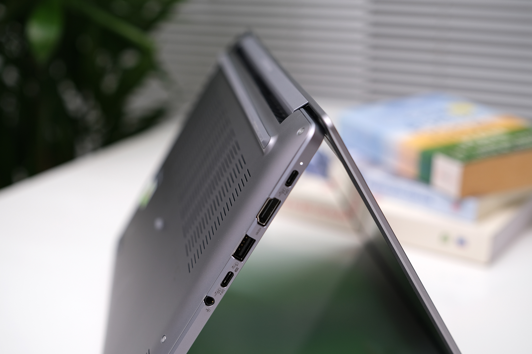 Cạnh bên với hai cổng đáng giá là USB 3.2 Gen 2 Type-C hỗ trợ cả sạc, xuất hình ảnh, dữ liệu. Điều này cho phép người dùng có thể kết nối với màn hình ngoài chỉ bằng một sợi cáp duy nhất, phục vụ tất cả nhu cầu từ sạc pin, mở rộng kết nối và làm việc trên màn hình rời. Ngoài ra còn có cổng USB-A, HDMI 2.1, giắc cắm âm thanh 3,5 mm.