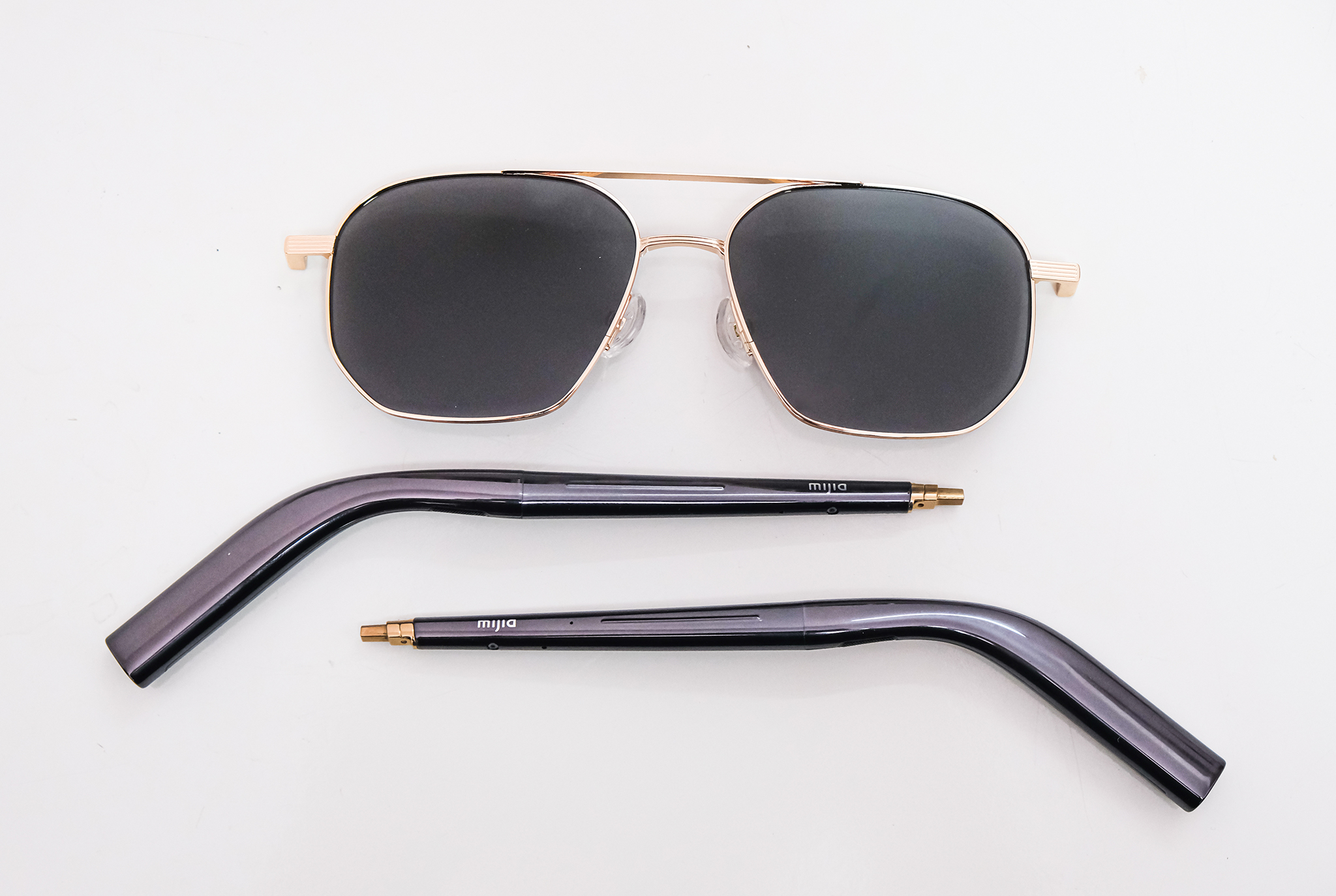 Xiaomi Mijia Smart Audio Glasses có ba lựa chọn kiểu dáng với khung khác nhau là Pilot-Style (trong hình), Titan và Browline cho sử dụng hàng ngày. Các kính đều có thể thay tròng tương tự kính thông thường, trọng lượng 27,6 gram, phần mỏng nhất càng kính là 5 mm.