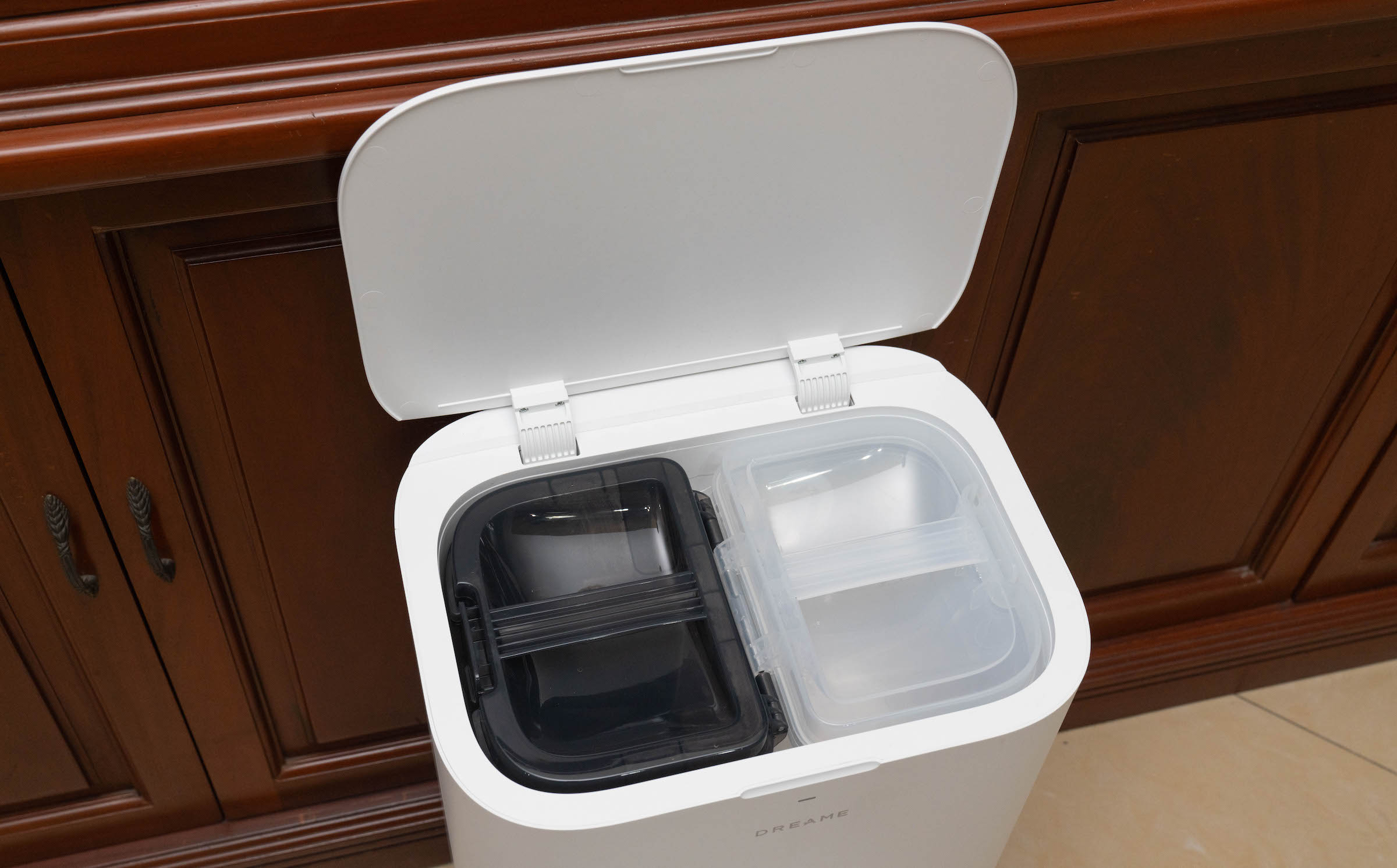 Thiết bị có hai khoang chứa nước bẩn và sạch với dung tích lần lượt 4 và 4,5 lít để tự động châm nước cũng như hút nước bẩn sau khi vệ sinh sàn. Tùy diện tích mặt sàn và chế độ lau, máy có thể hoạt động ít nhất ba ngày mới phải thay nước. Phần trạm sạc cũng thừa hưởng tính năng từ các model cao cấp như tự đổ rác, giặt giẻ, sấy khô bằng khí nóng hay tự động pha nước lau sàn. Tuy nhiên, với tính năng tự pha nước lau sàn người dùng phải mua thêm phụ kiện hộp đựng dung dịch. Dreame sử dụng túi đựng rác với dung tích 3,2 lít cho thời gian sử dụng 100 ngày.