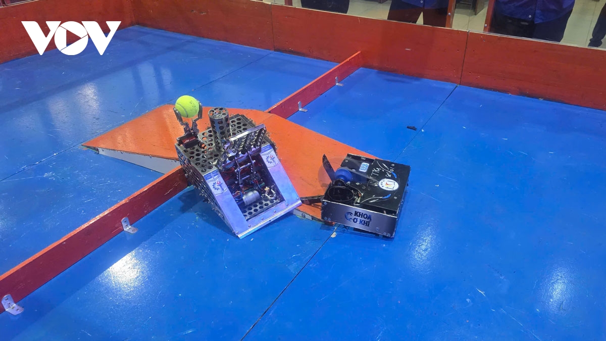 Trong khi đó, robot của Trường Cao đẳng Kỹ thuật Cao Thắng mang một triết lý thiết kế khác. Nguyễn Văn Quang, sinh viên đại diện đội chia sẻ, Robot của đội Cao Thắng có ba bộ phận chính: bánh di chuyển bằng dây đai cao su để tối ưu hóa độ bám sân, đảm bảo khả năng cơ động và chống trượt khi va chạm; cơ cấu gắp bóng (mô phỏng cánh tay robot công nghiệp) có lực kẹp lên đến 20kg, cho phép kiểm soát bóng chắc chắn; và cơ cấu tấn công được tinh chỉnh nhiều lần để đạt hiệu quả chiến đấu cao nhất.