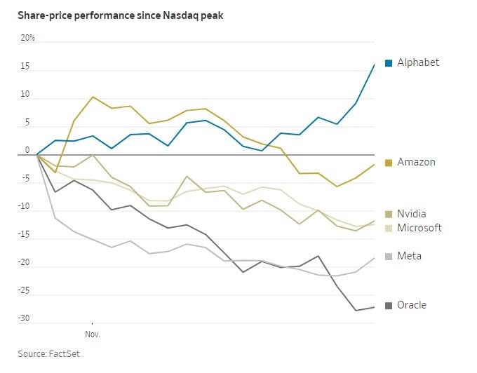 Mức tăng cổ phiếu của các tập đoàn công nghệ kể từ khi chỉ số Nasdaq đạt đỉnh (%)