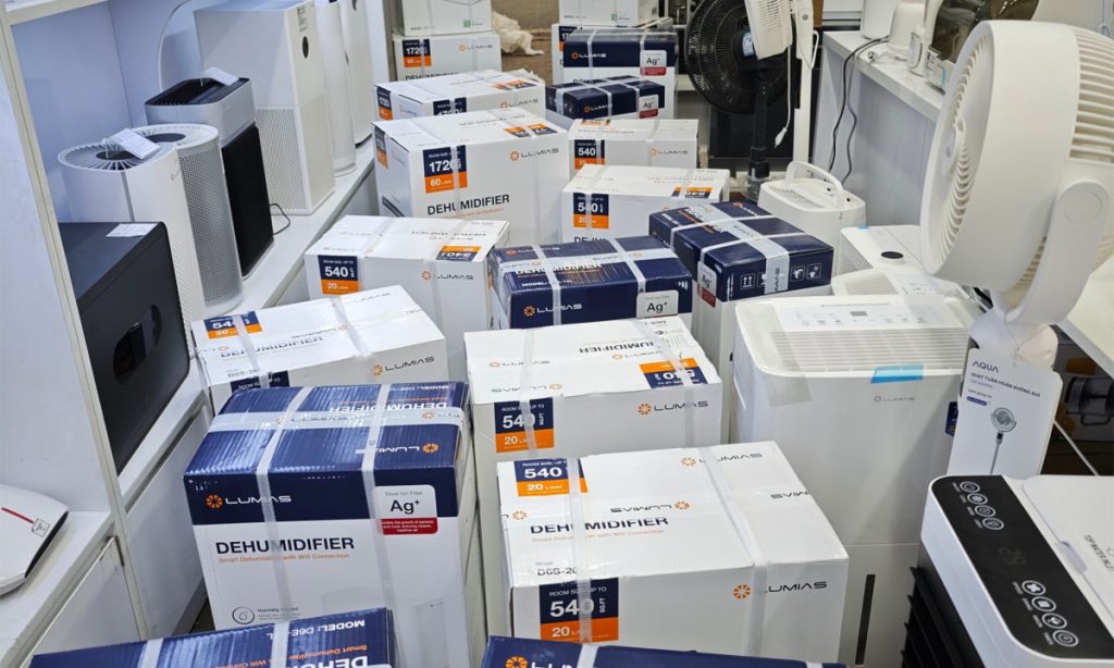 Máy hút ẩm xếp kín lối đi một cửa hàng để chờ chuyển cho khách cuối tuần qua. Ảnh: Lê Mạnh Toàn