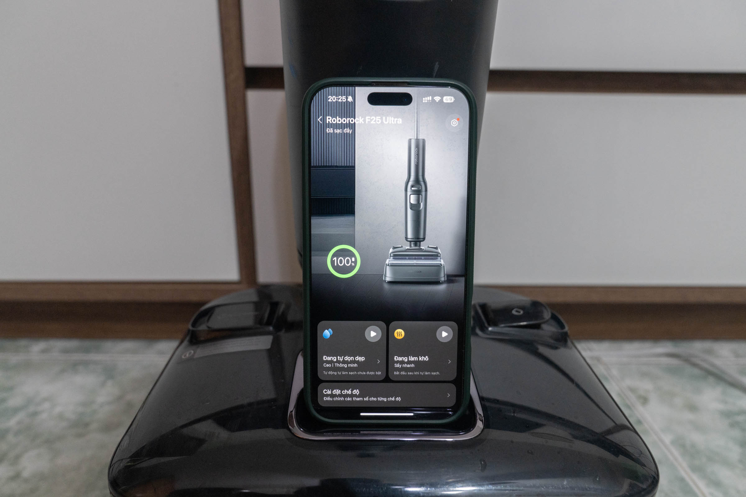 F25 Ultra trang bị lưỡi gạt kép giúp chống rối, lông thú cưng hay tóc khi cuốn vào 1/4 con lăn sẽ bị lưỡi gạt tách ra và hút vào hộc chứa. Máy có tính năng giặt con lăn bằng nước nóng 90 độ C. Ngoài ra, trạm sạc cũng tích hợp buồng sấy đối lưu sử dụng quạt không chổi than để thổi khí nóng tới 95 độ C, giúp làm khô con lăn trong 5 phút ở chế độ sấy nhanh và 30 phút khi sấy yên tĩnh. Tính năng sấy nóng giúp con lăn không bị mùi ẩm mốc và người dùng không cần tháo ra để khô tự nhiên như các model không có công nghệ này, nhờ đó trạm sạc cũng nhỏ gọn hơn.