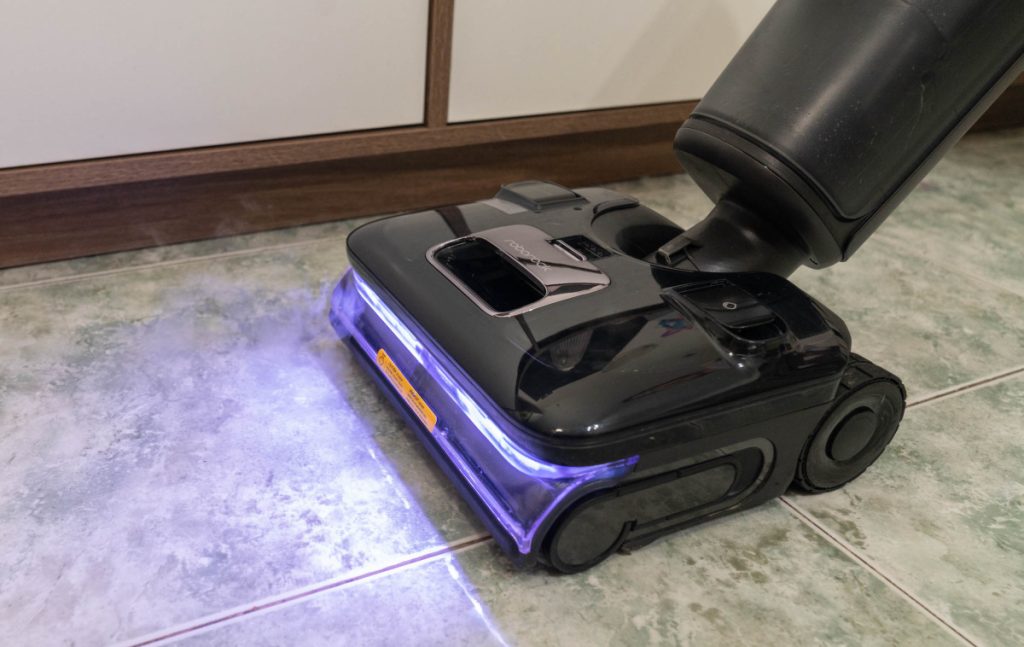 Lực hút của máy lên tới 22.000 Pa – mức cao nhất trên các mẫu máy lau nhà cầm tay hiện nay, đủ để hút sạch bụi mịn, tóc, lông thú và mảnh vụn lớn. Bình nước sạch được chuyển xuống phần đế lau giúp giảm trọng lượng tay cầm và tăng lực ép con lăn để làm sạch tốt hơn. Hộp chứa có thêm một ngăn nhỏ cho dung dịch lau sàn. Thiết bị sẽ tự pha dung dịch và nước sạch, một lần đổ đầy có thể sử dụng 30 ngày.