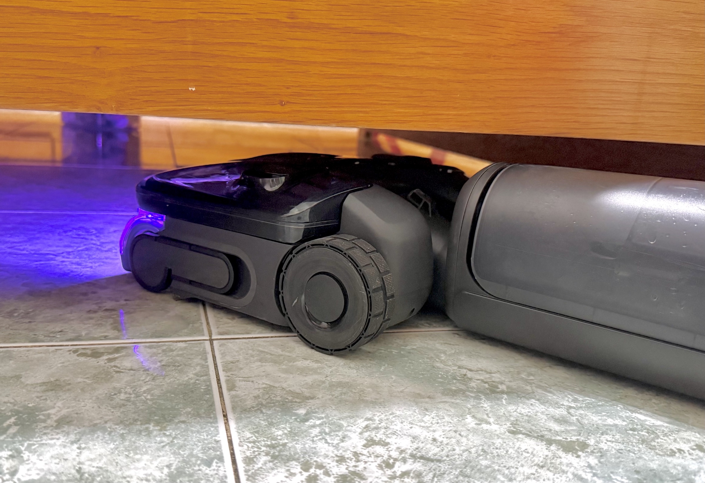 Tương tự các model lau nhà ra mắt trong năm nay, sản phẩm có thiết kế gập sát 180 độ với độ dày 12,5 cm và bánh xe nhỏ trên tay cầm để chui vào khu vực thấp như gầm giường, ghế. Bánh xe có trợ lực và sử dụng AI nhận diện hướng đẩy hay kéo và thay đổi hướng quay theo thời gian thực. Trải nghiệm thực tế, việc làm sạch nhẹ nhàng hơn các thế hệ trước. Khi cho thiết bị chui vào gầm giường, người dùng có thể điều khiển tiến lùi, hay chuyển hướng thông qua ứng dụng trên smartphone. Loa ngoài tích hợp phía sau tay cầm, hỗ trợ thông báo bằng tiếng Việt.