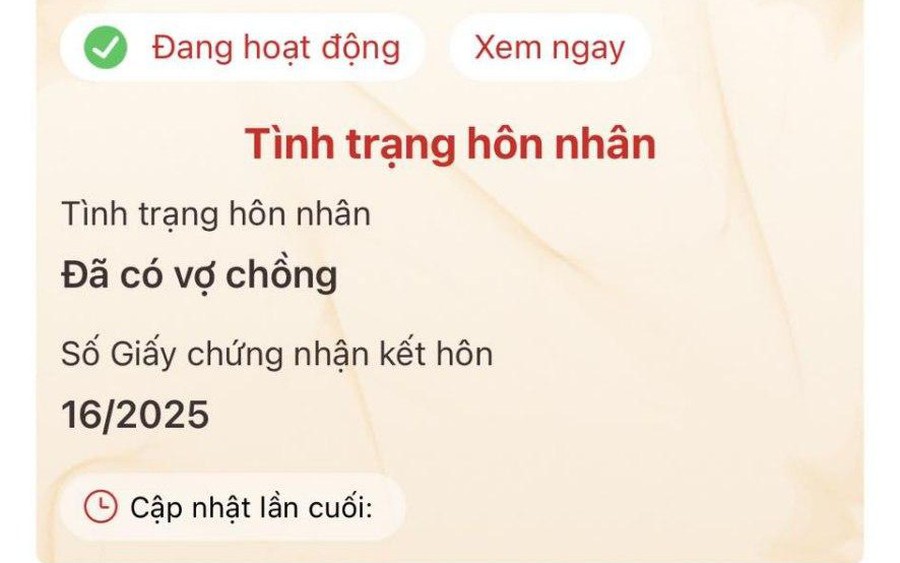 Tình trạng hôn nhân đã được cập nhật lên ứng dụng VNeID. Đây là việc đồng bộ thông tin về tình trạng kết hôn hoặc độc thân của bạn từ hệ thống Cơ sở dữ liệu Quốc gia về Dân cư vào tài khoản định danh điện tử VNeID của bạn.