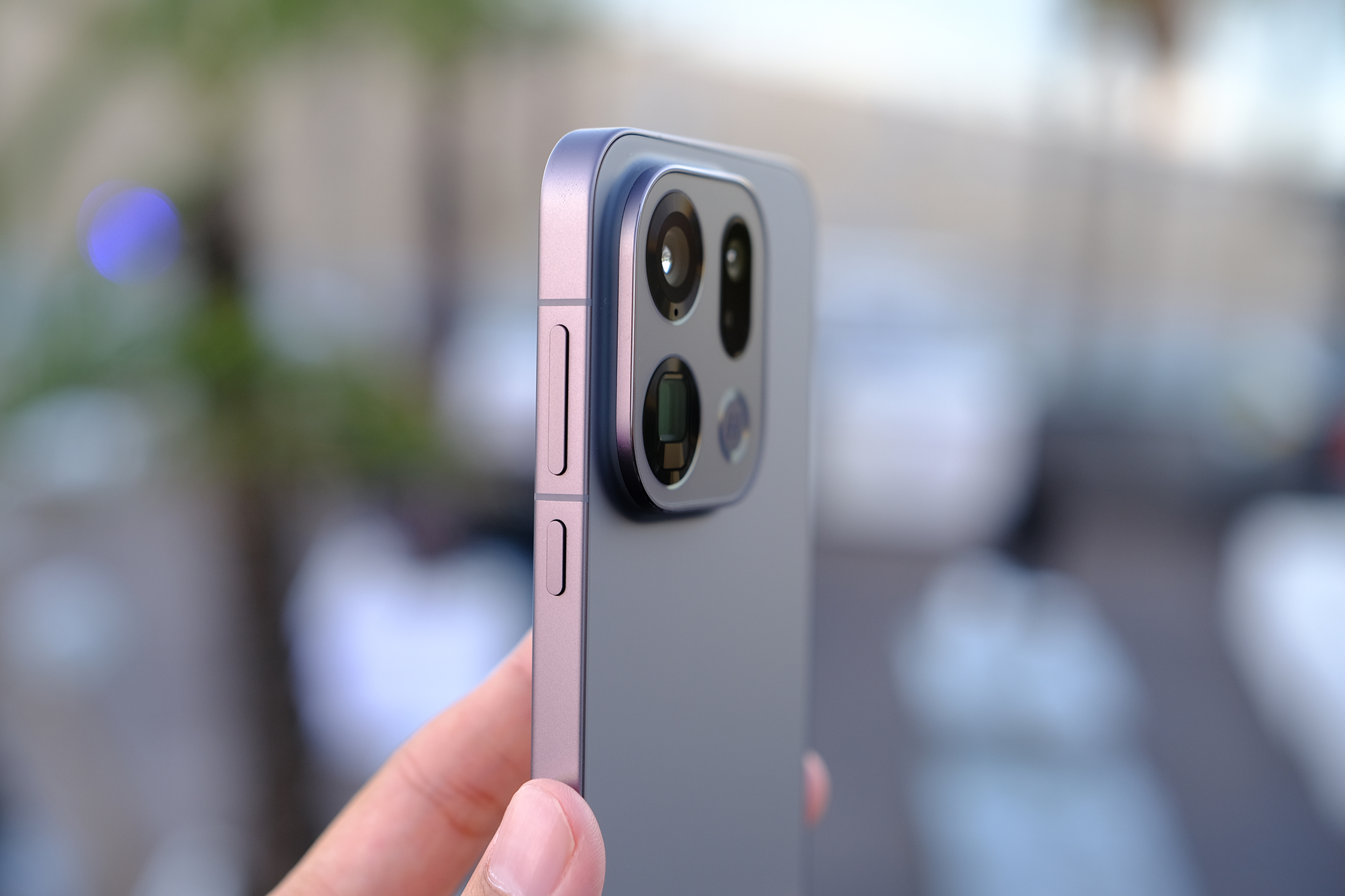 Find X9 cũng có nút chụp hình giống iPhone 17. Người dùng cũng có thể sử dụng cảm ứng lực để vuốt cho thao tác chuyển đổi mức zoom và ấn mạnh để chụp. Vị trí nút đặt hơi sâu phía trong, tương tự cách bố trí của Apple. Việc chuyển sang thiết kế vuông vức cũng giúp tiết diện cạnh lớn hơn, thao tác cầm chụp ảnh theo chiều ngang thoải mái hơn trên Find X9 Pro so với Find X8 Pro năm ngoái.