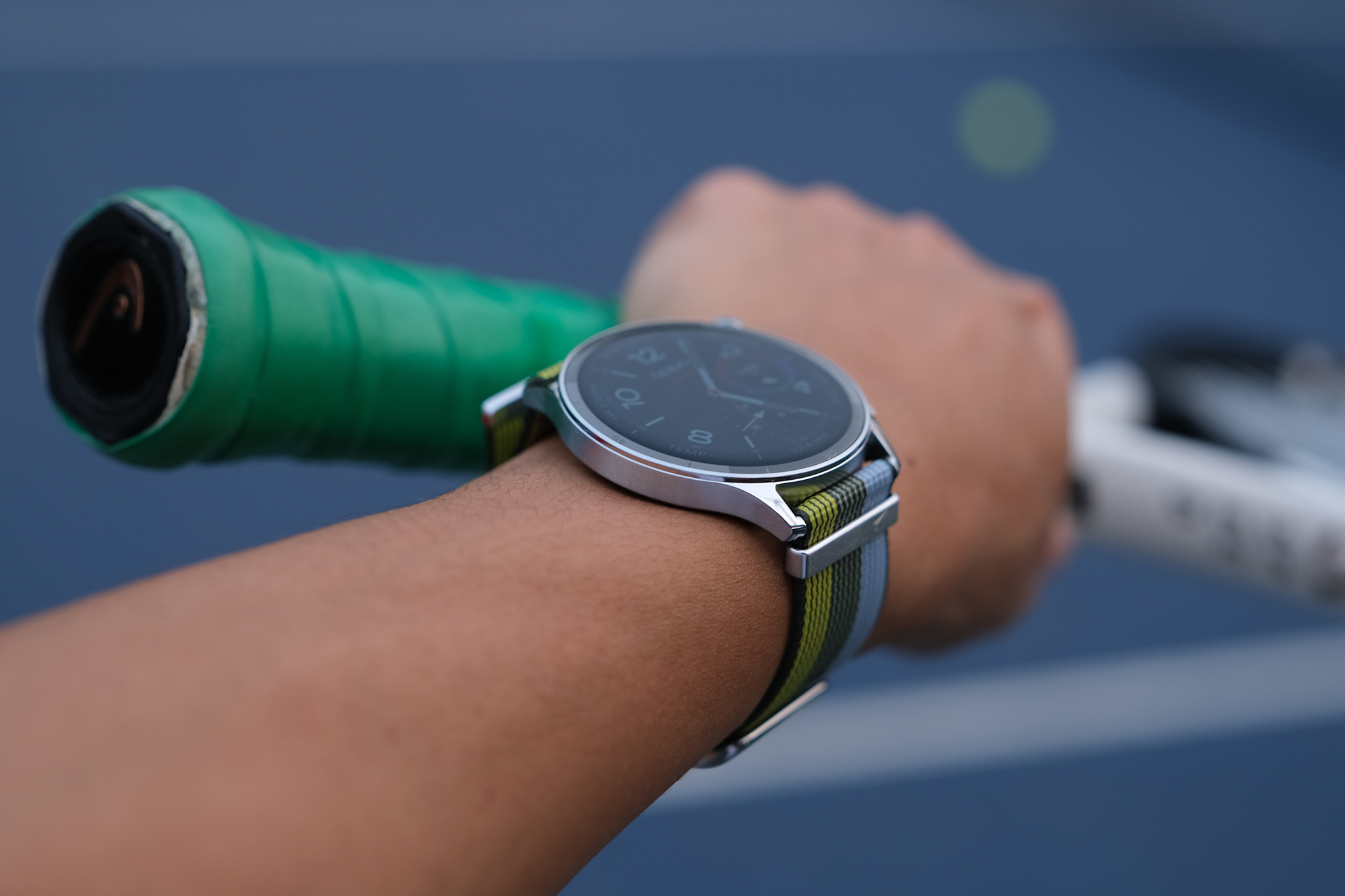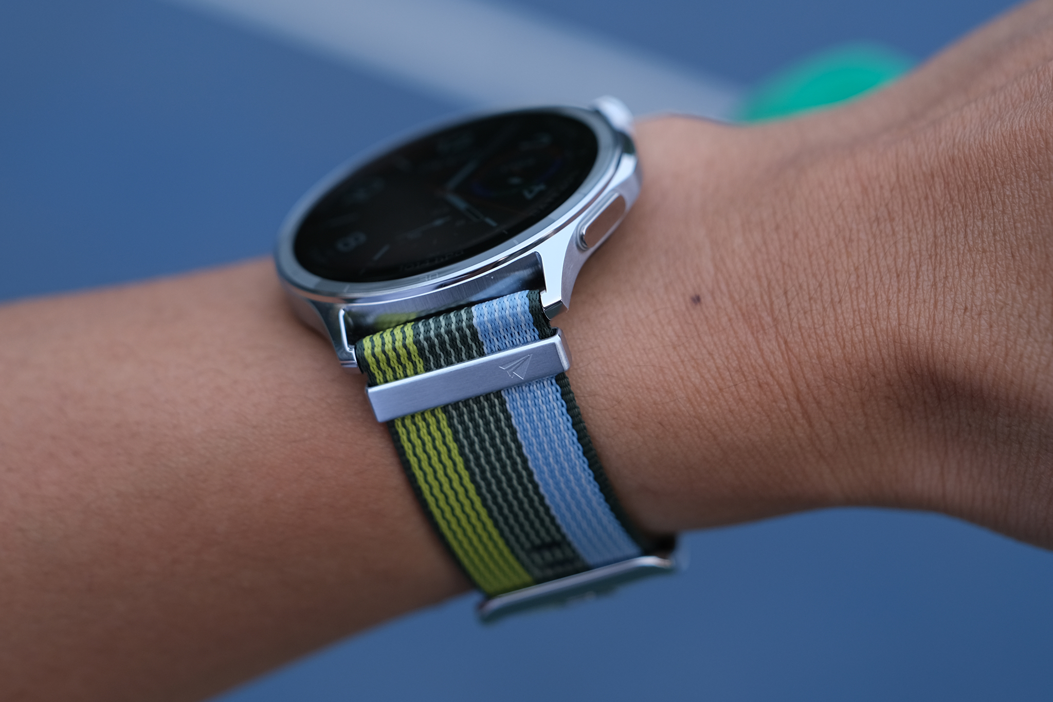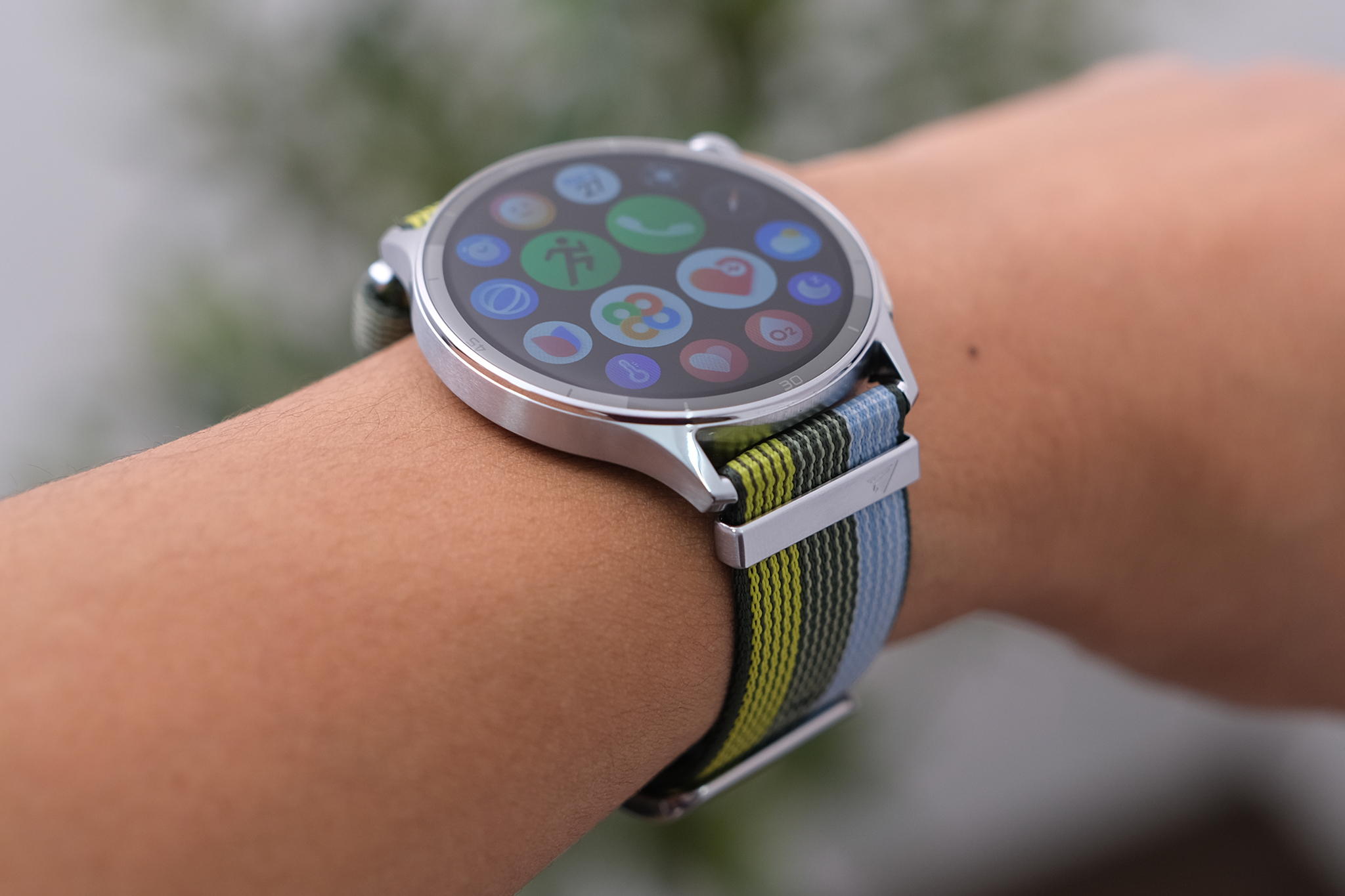 Cảm giác đeo Watch S rất thoải mái, đặc biệt khi kết hợp cùng dây dệt sợi nylon thoáng khí với màu vàng xanh tương phản với mặt đồng hồ màu bạc. Nếu thường xuyên tập luyện thể thao, người dùng sẽ cần sắm thêm các mẫu dây bằng silicon sẽ giúp đồng hồ đeo chắc hơn khi ra nhiều mồ hôi.