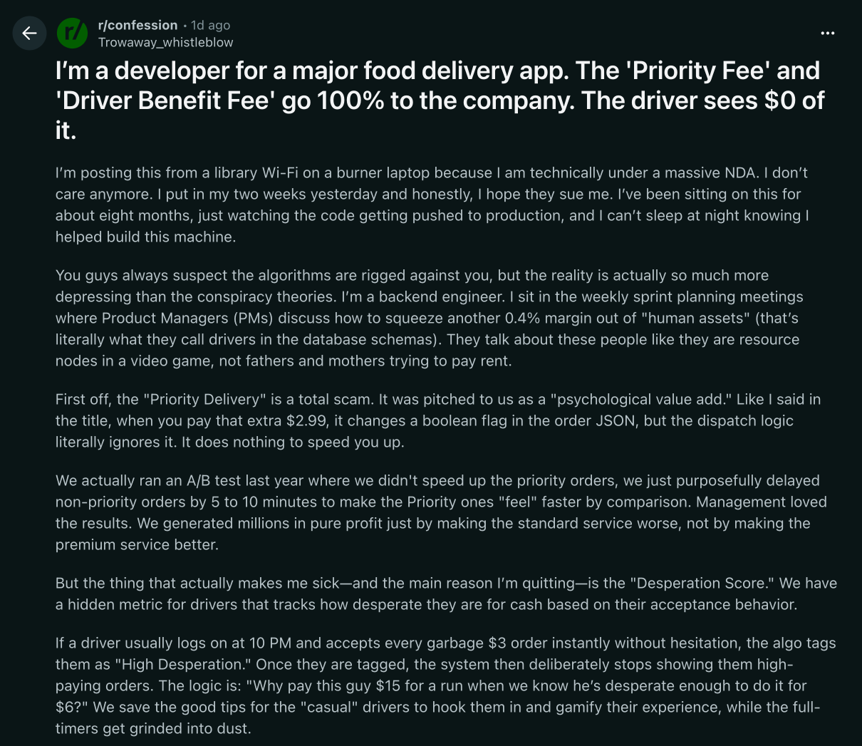 Trong bài viết đăng ở cộng đồng confession trên Reddit, tác giả cho biết mình là lập trình viên backend của một nền tảng giao đồ ăn quy mô lớn, đang chuẩn bị nghỉ việc và chấp nhận rủi ro vi phạm NDA để nói ra những gì diễn ra phía sau hệ thống. Theo người này, thực tế thậm chí còn đáng buồn hơn rất nhiều so với các suy diễn của mọi người.
