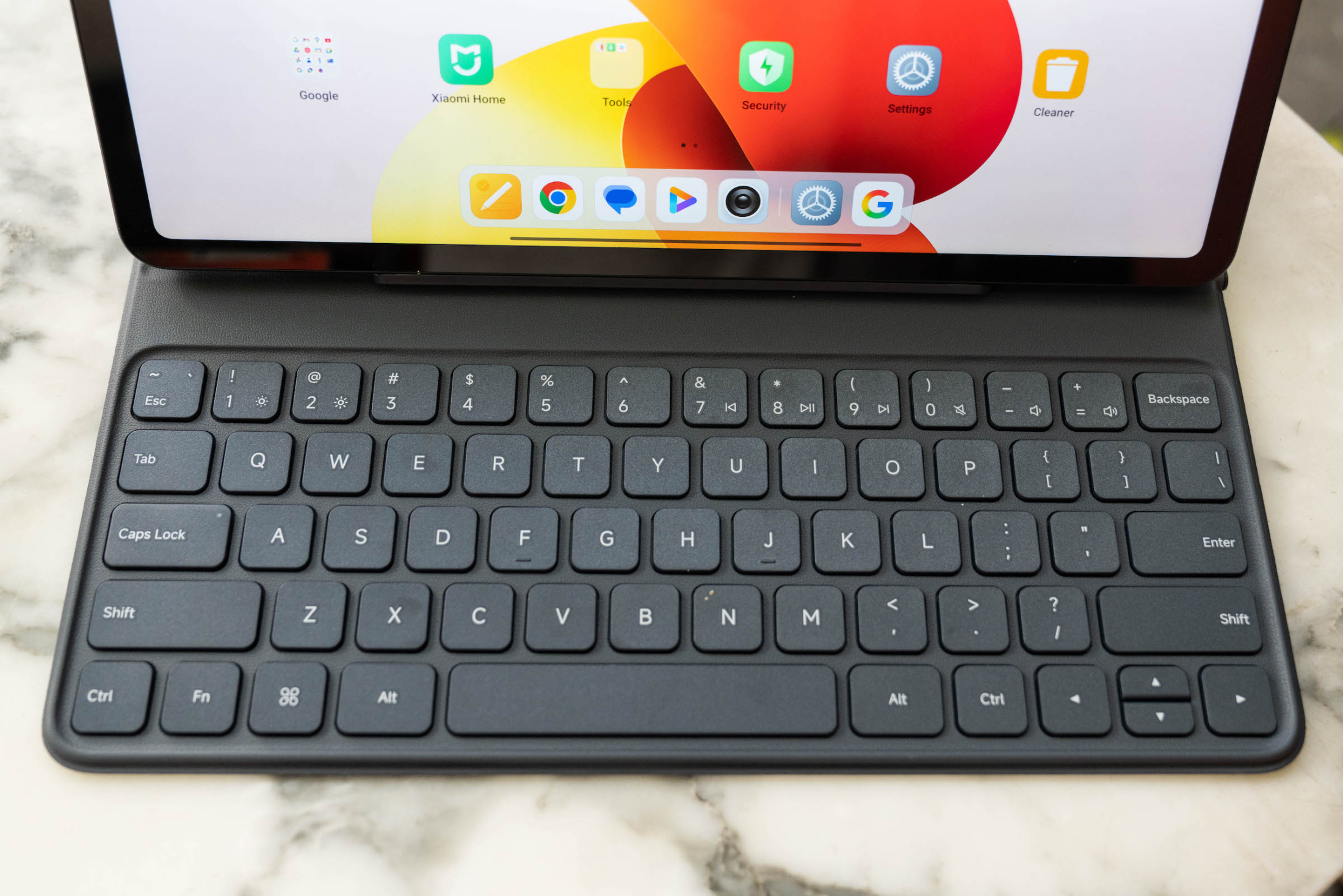Case bảo vệ kiêm bàn phím đi kèm được đánh giá phụ kiện đáng giá. Bàn phím kích thước lớn, hành trình phím dài, độ nảy tốt, nhưng không có touchpad. Do giá rẻ, bàn phím này chỉ kết nối với Redmi Pad 2 Pro bằng Bluetooth và phải sạc riêng nên dày hơn so với các model cao cấp dùng kết nối nam châm.