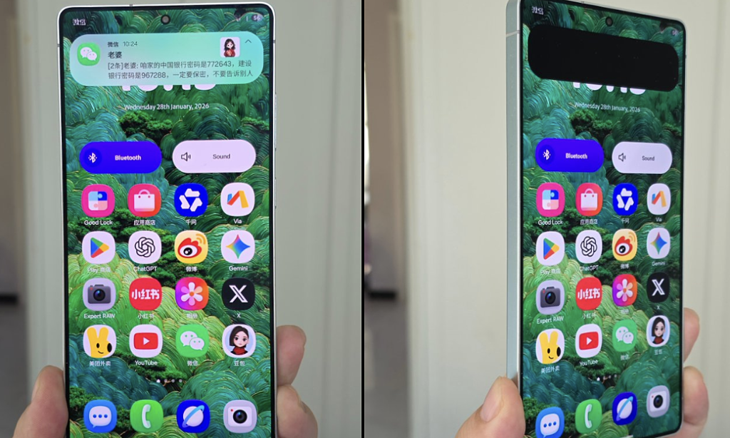 “Chuyên gia tin đồn” Ice Universe cũng đăng hai hình ảnh trên X, hé lộ về cách màn hình chống nhìn trộm hoạt động. Theo đó, thiết bị Samsung sẽ làm mờ cục bộ từng khu vực khi nhìn nghiêng, thay vì toàn bộ màn hình như tấm dán chống nhìn trộm thông thường.