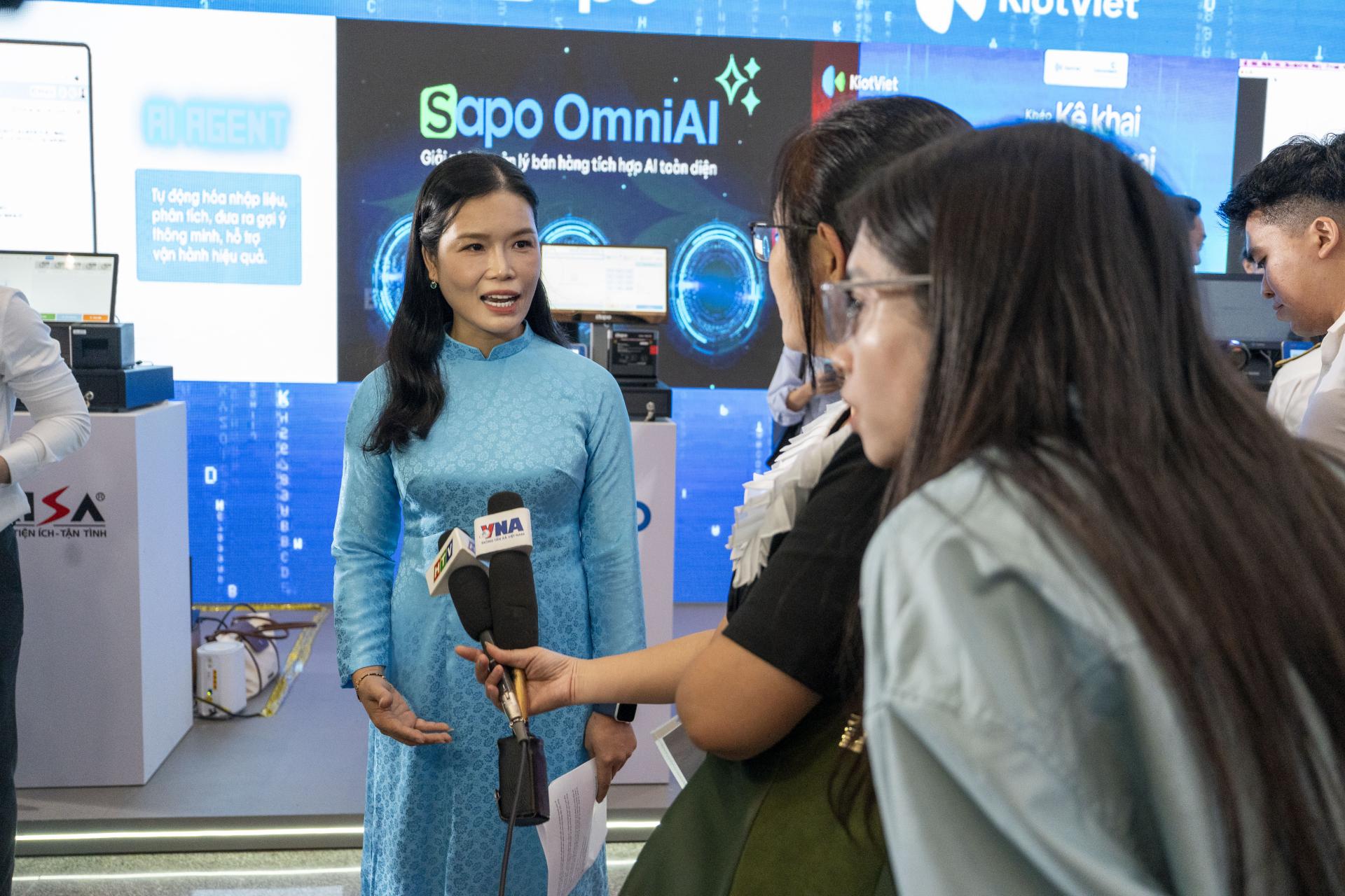 Tại gian hàng, Sapo giới thiệu nền tảng OmniAI hợp kênh, ứng dụng AI toàn trình trong quản lý bán hàng, hóa đơn điện tử, kế toán, kê khai và nộp thuế. Công nghệ này giúp đồng bộ dữ liệu từ nhiều kênh bán hàng (cửa hàng, sàn TMĐT, website, mạng xã hội, ứng dụng chat) về một nền tảng duy nhất.