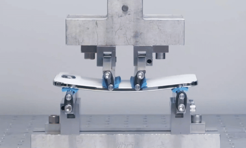Hãng sử dụng máy mô phỏng áp lực 60 kg nhắm vào giữa điện thoại – phần dễ uốn cong nhất. Khi máy ngừng ấn xuống, iPhone Air bật thẳng trở lại và không có hiện tượng cong vênh.